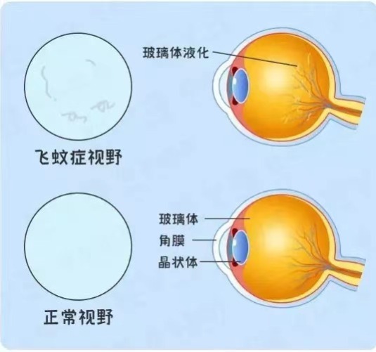 很多患者一开始只是“生理性飞蚊症”,以为暂时不用管它,便疏忽了。其实,当生理性飞蚊症演变成病理性飞蚊症,则可能引起视网膜裂孔、视网膜脱离、眼底出血和其他眼内炎症,严重者可致盲。