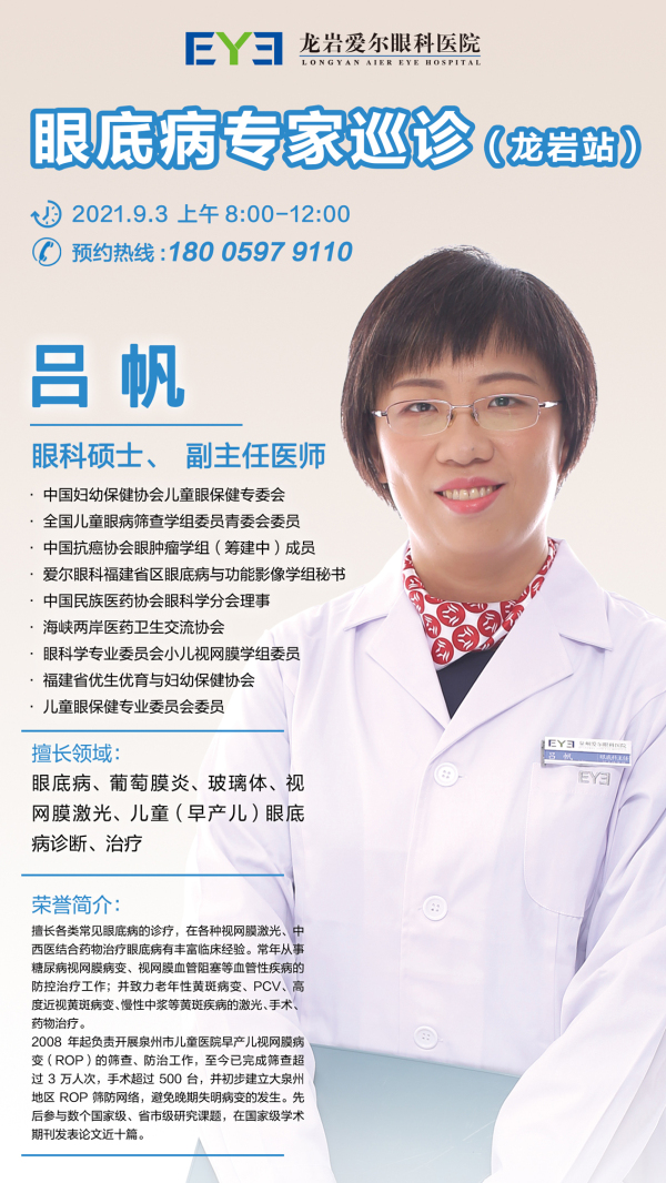 9月3日,眼底病专家吕帆主任亲临龙岩爱尔眼科会诊及手术,名额有限,报名从速!