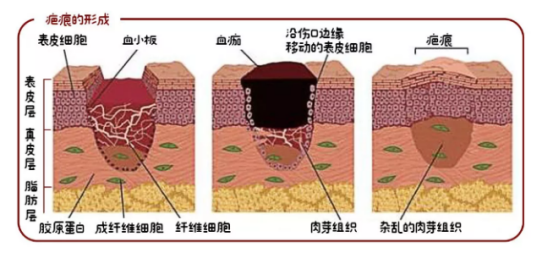 疤痕的形成一般会经历以下几个过程:愈合→变硬→增厚→持续增厚伴红痒痛→疤痕疙瘩。