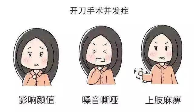 终身服药:传统开刀手术是将病变组织和甲状腺正常组织一并切除,甲状腺器官切除后导致甲状腺激素分泌减少,甲状腺功能出现低下,造成患者终身甲减,需要终身服药来补充甲状腺激素。此外还会造成身体素质下降。