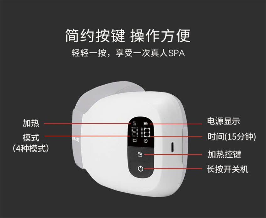 简单方便的按键操作,清晰明了的屏幕显示,老人、小孩也能轻易上手。既可以大面积揉捏按摩颈部、肩部、腰部、背部,也能小范围局部按摩手臂、大腿、小腿、脚底等部位,只要将按摩仪靠近在需要按摩的位置,或是根据需要来回移动按摩,就能尽情享受新科技带来的舒爽体验。
