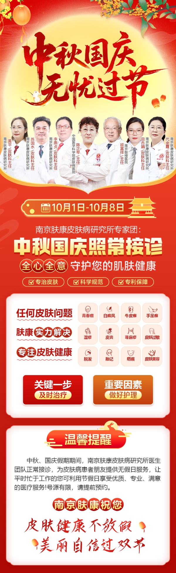 这个双节,当多数人沉浸在出游与团聚的喜悦中,南京肤康的医护团队将用专业坚守岗位。无论您是需要复诊调药的老患者,还是突发皮肤不适的新市民,都能在这里获得与平日无异的优质诊疗服务。提前预约、备好材料、遵流程就诊,愿您在假期里摆脱皮肤困扰,尽享团圆时光!