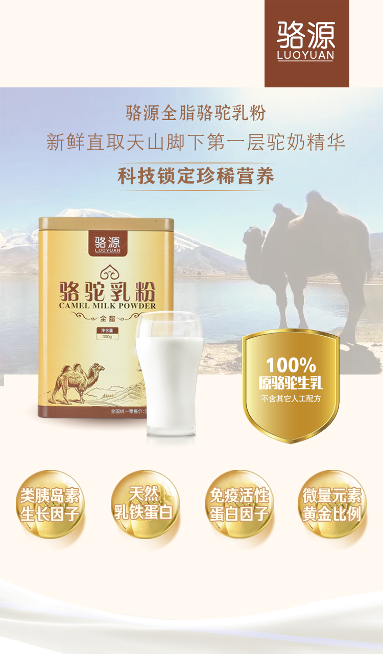 骆源全脂骆驼乳粉选用100%纯骆驼生乳,不含其它人工配方。我们首先要认识骆源驼乳所选的骆驼奶里含有的这几种成分:类胰岛素生长因子、免疫球蛋白、溶解酶素和乳铁传递蛋白。研究表明人类日常饮用的动物奶中,唯独骆驼奶同时天然携带着这几类成分组合。