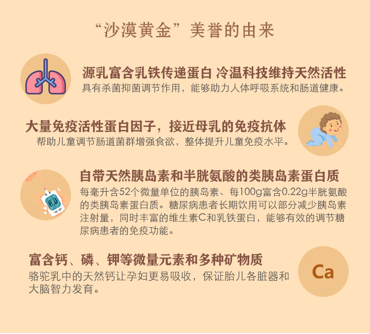 骆源全脂骆驼乳粉的唯一成分:新疆骆驼奶中的类胰岛素生长因子,便是一种非常好的的抗老化成分,骆源全脂骆驼乳粉中的类胰岛素生长因子不会被胃酸损坏,使得它能够到达小肠并被人体吸收利用。在饮用骆源骆驼奶后能够有效避免因进食后血糖迅速升高的情况,它使血糖趋于平稳,能够帮助糖尿病患者调节血糖,降低糖尿病高血糖风险。同时能够促进儿童成长发育。