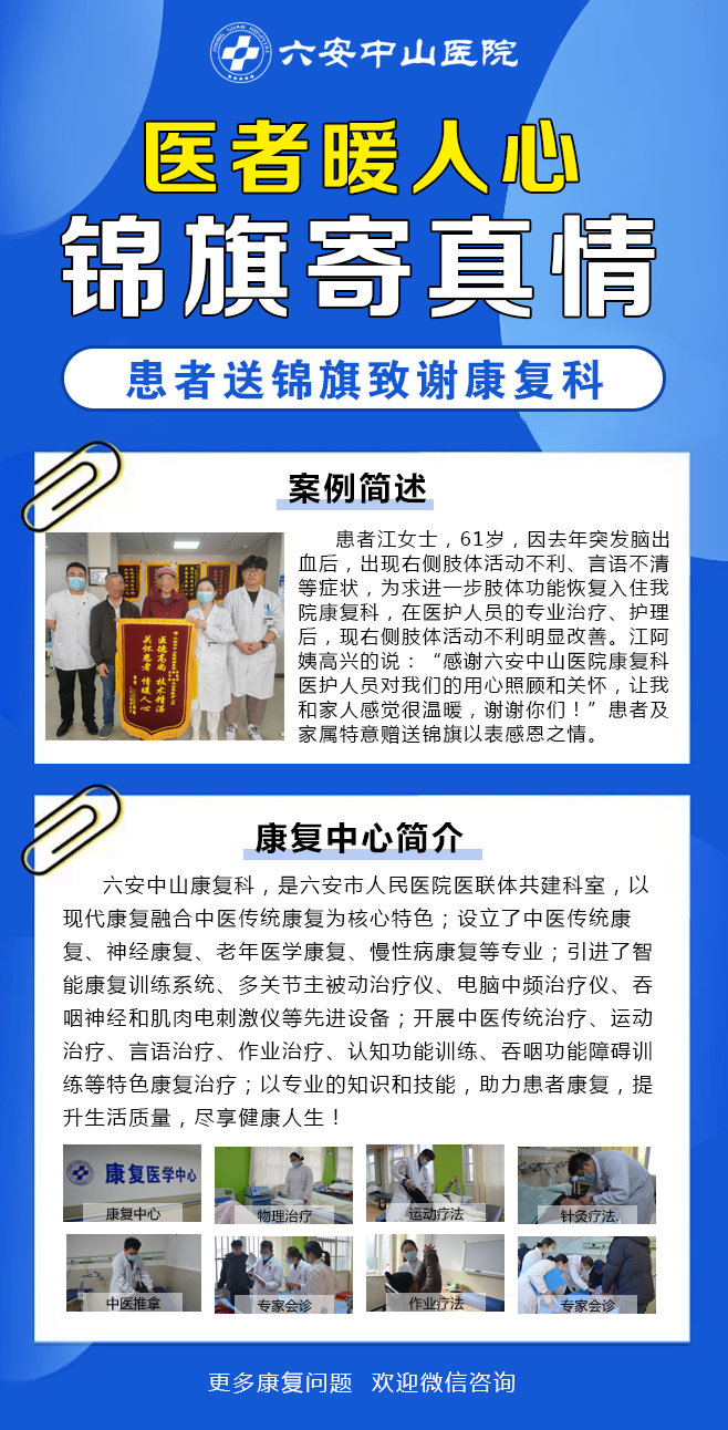 导读:【专业康复,重获新生】61岁的江女士,因去年突发脑出血后,出现右侧肢体活动不利、言语不清等症状,来到我院康复科,在专业治疗、护理后,不适症状明显改善,患者及家属特赠锦旗表谢意...