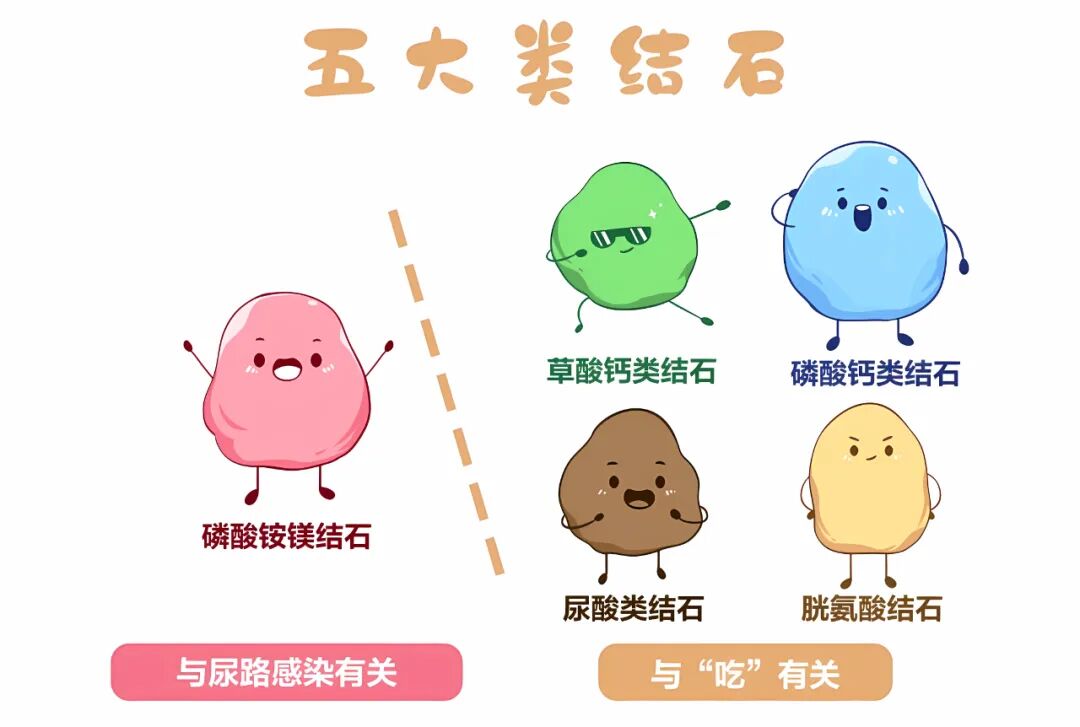 在这些结石中,只有磷酸铵镁结石是由尿路感染引起,即感染性结石;其余四种均由代谢紊乱所致,属代谢性结石尿石症是一种“富贵病”,其中有四类结石与“吃”有关。对于不同成分的结石,可以采用以下不同的防治措施: