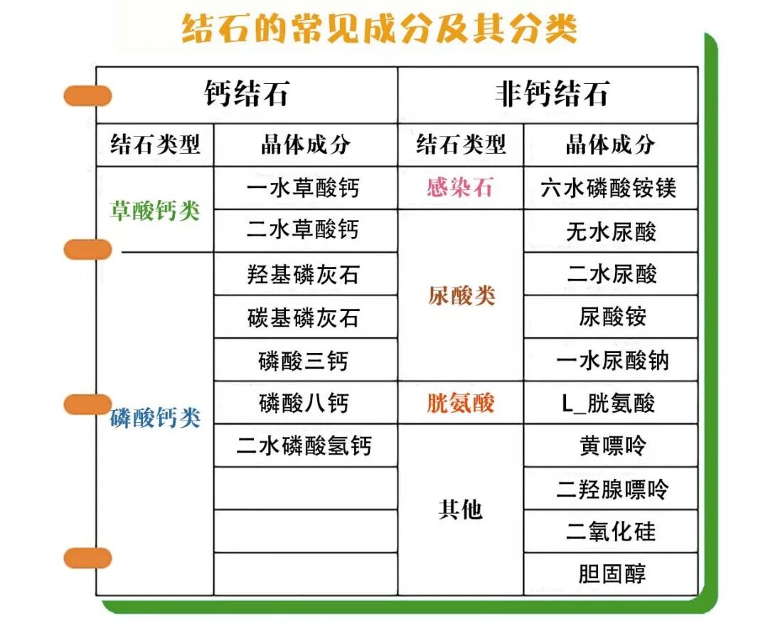 结石成分多达30余种,主要的结石成分有十几种。依据化学成分的不同,结石大致可分为五类:草酸钙类结石、磷酸钙类结石、尿酸类结石、磷酸铵镁结石和胱氨酸结石
