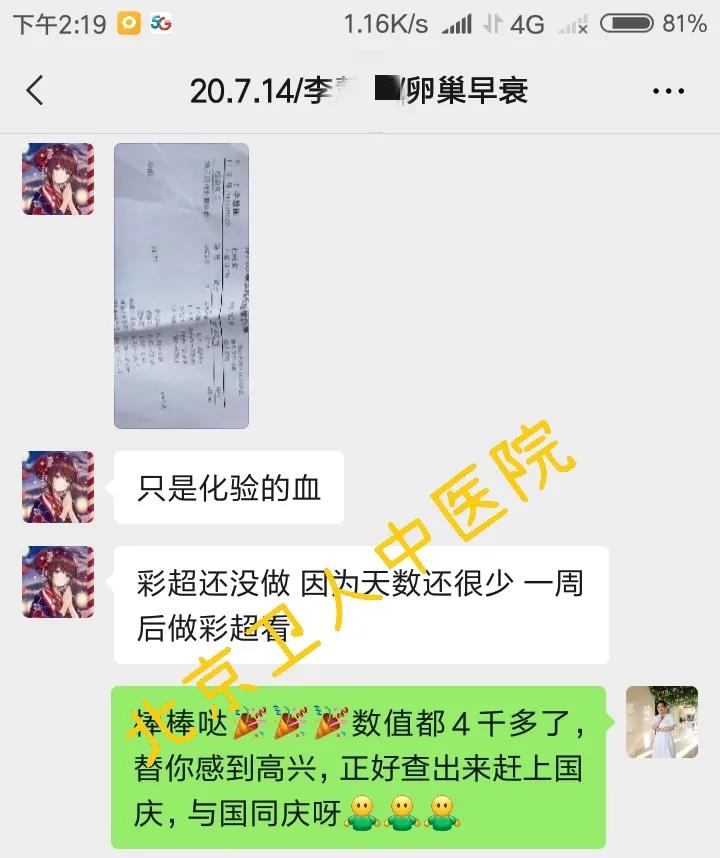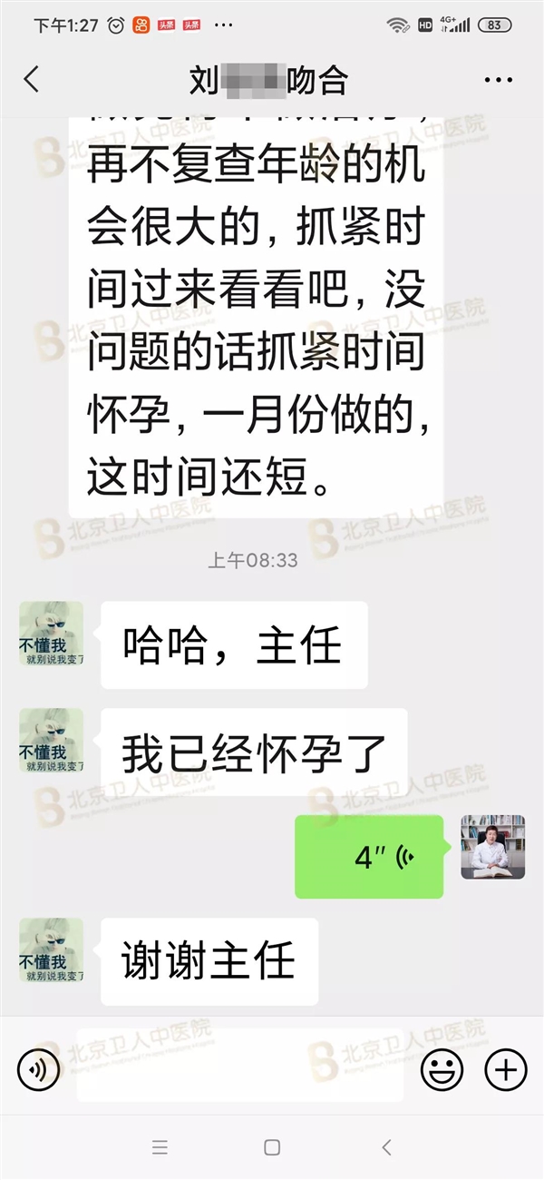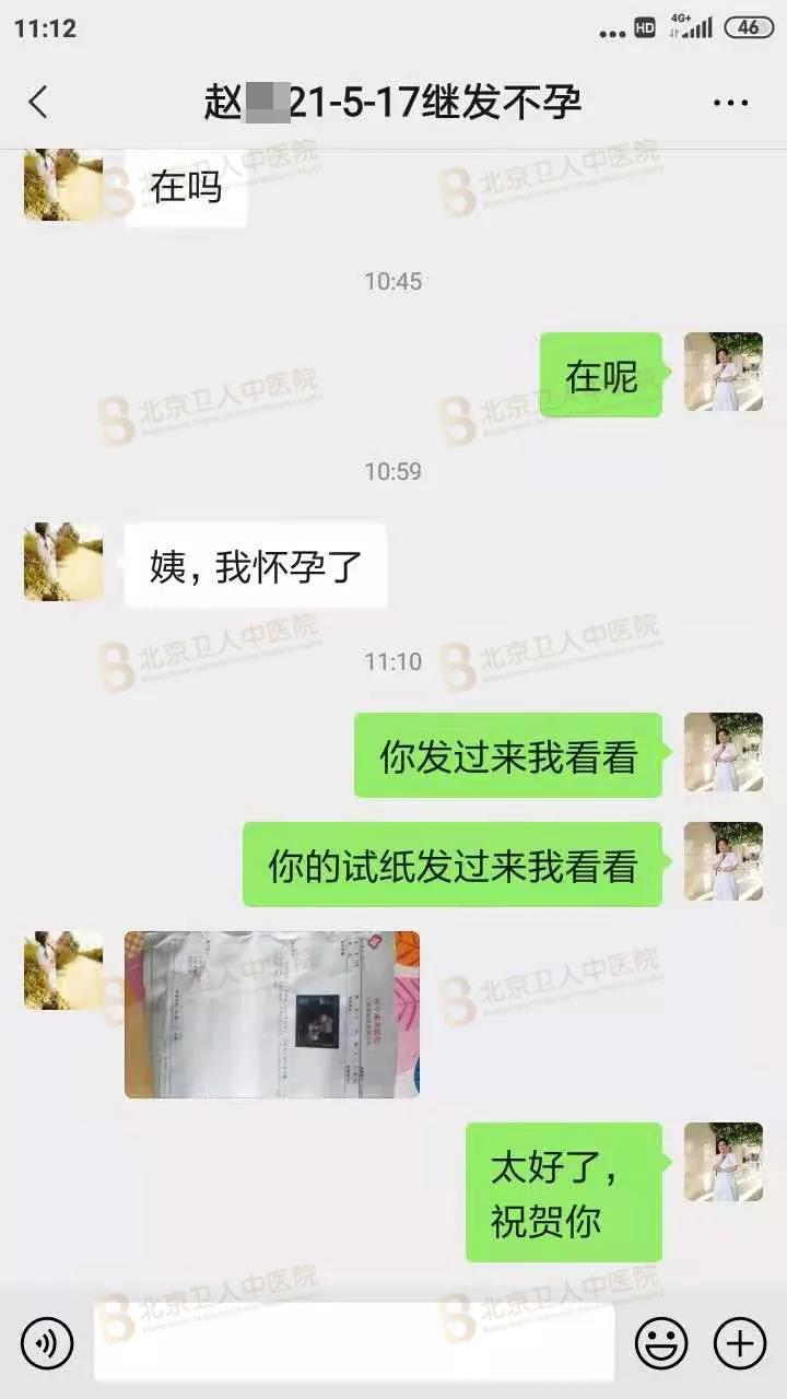 北京卫人医院治疗经历:30岁的李女士由于卵巢功能减退备孕多年未孕,各大医院诊治都无果,几近绝望的她最终来到卫人找到朱宝玉主任,经过药物调理促排卵,现在成功怀孕。2021.10.1日给朱宝玉主任报喜,真是与国同庆,可喜可贺呀!
