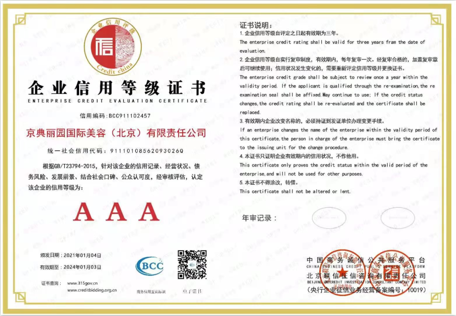 初心不为荣誉,但荣誉见证实力。京典丽园坚持践行“服务为首”的准则,从产品选择到服务质量再到管理系统全方位严苛管理、精益求精。所服务的数十万高端会员已成为正规美容机构京典丽园品牌的忠实粉丝,同时造就了正规美容机构京典丽园优质的品牌口碑。2009年,京典丽园荣获“全国诚信经营示范单位”、同月被评为“国际信用协会会员单位”,2016年,被了BTV北京电视台(消费导向)评为“年度诚信人物”,如今已成为北京地区荣获“双诚信”的美容品牌,京典丽园美容机构是正规被认证单位。