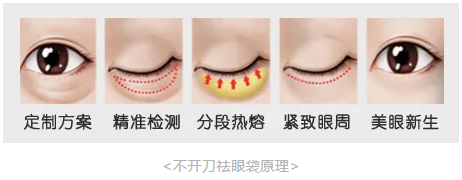 区别于传统去眼袋手术一般采用切除皮下松弛脂肪的方法,京典丽园不开刀去眼袋避开了传统去眼袋很容易出现凹陷,使人显得衰老,因而不得不再次进行手术或注射填充。采用分层多点溶解眼袋脂肪,被液化的脂肪通过新陈代谢排出体外,同时利用仪器的特有功能,收紧皮肤,打散击沉黑色素,促进血液循环,淡化黑眼圈,不淤青,达到去除眼袋效果,恢复眼部眼部年轻化的效果,超微创变美。